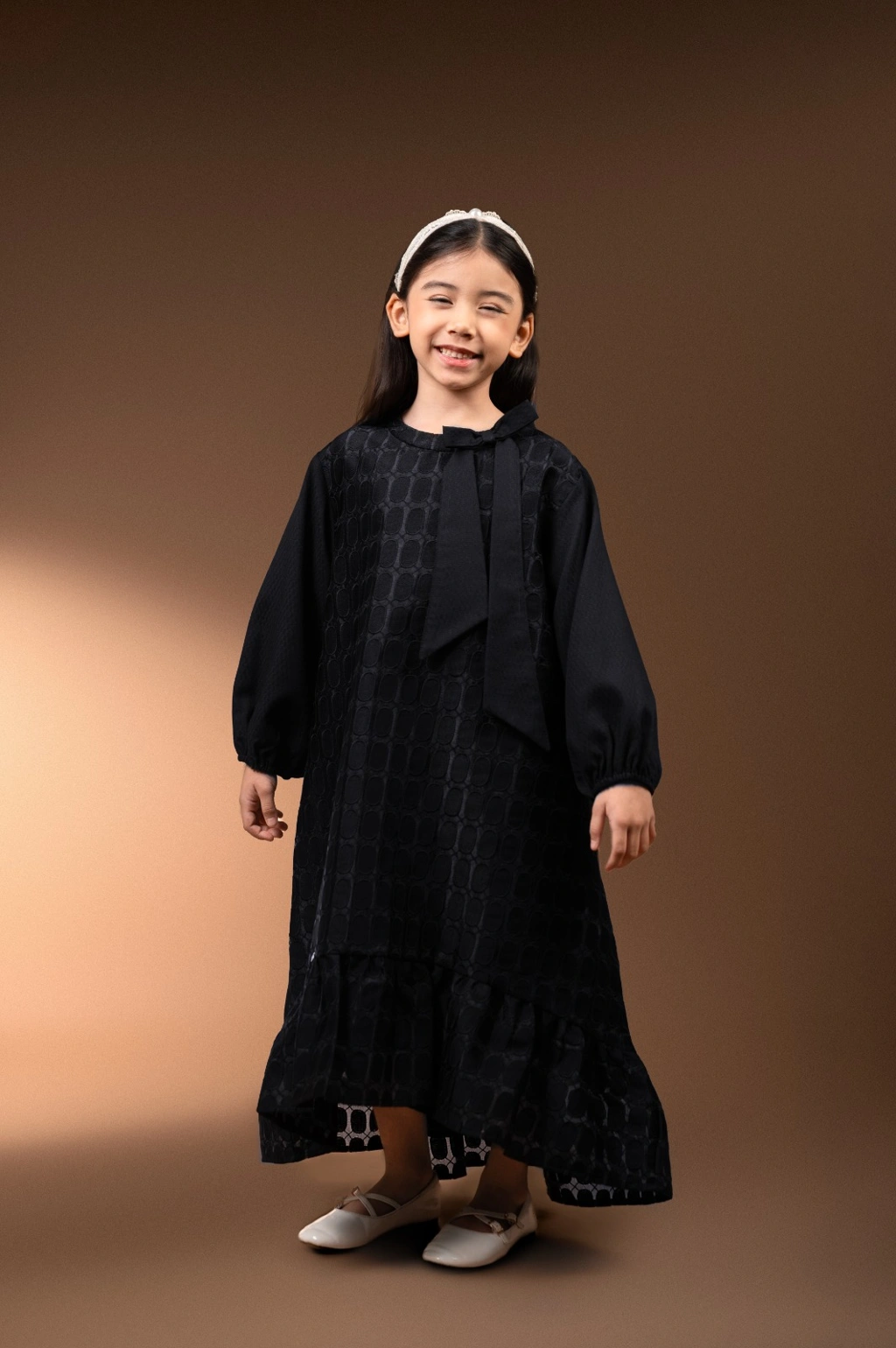 Terdapat detail pita di bagian leher yang memberikan kesan manis untuk anak-anak.