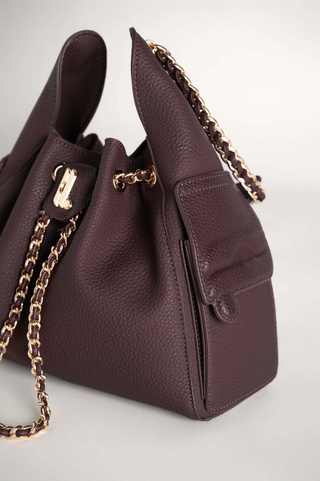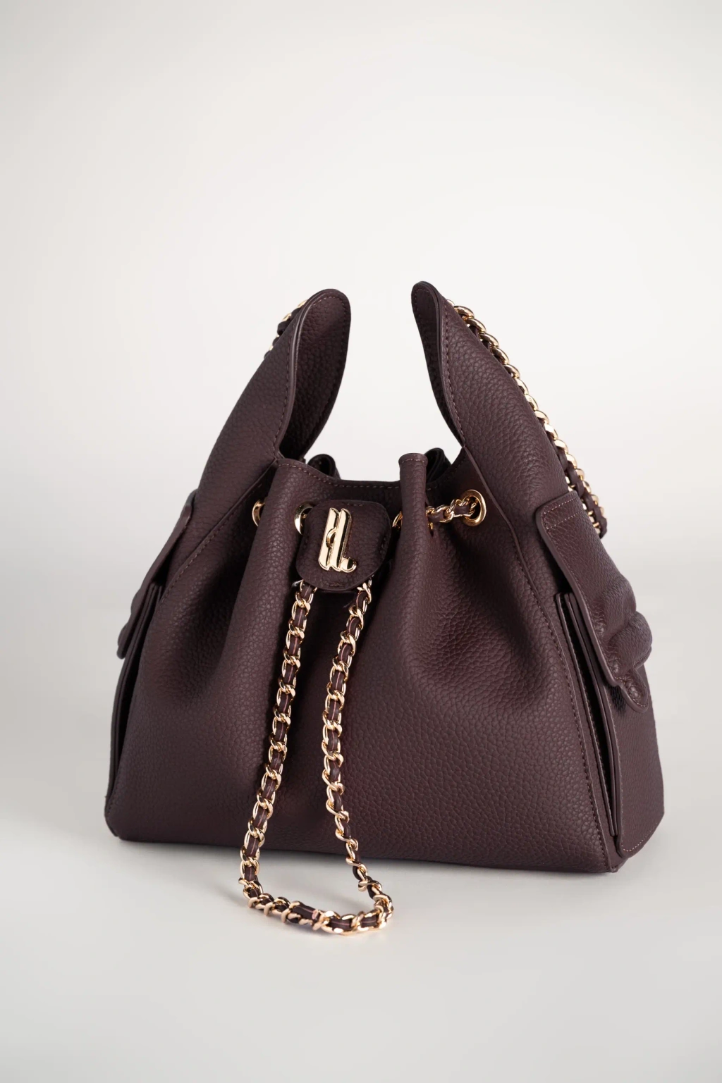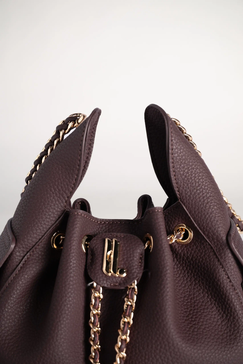 Bagian atas tas dilengkapi dengan sistem tali serut (drawstring) yang dihiasi rantai berwarna emas, terjalin dengan aksen kulit senada. Detail rantai ini tidak hanya menambah nilai estetika, tetapi juga mempertegas karakter tas yang anggun dan berkelas. Selain itu, material yang digunakan lebih ringan sehingga nyaman dikenakan dalam waktu lama (Lightweight). Di bagian depan, terdapat flap kecil dengan logo huruf “Heylocal” berwarna gold yang menjadi sentuhan khas dari desainnya.
