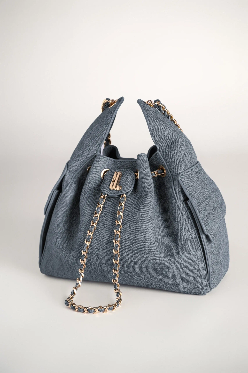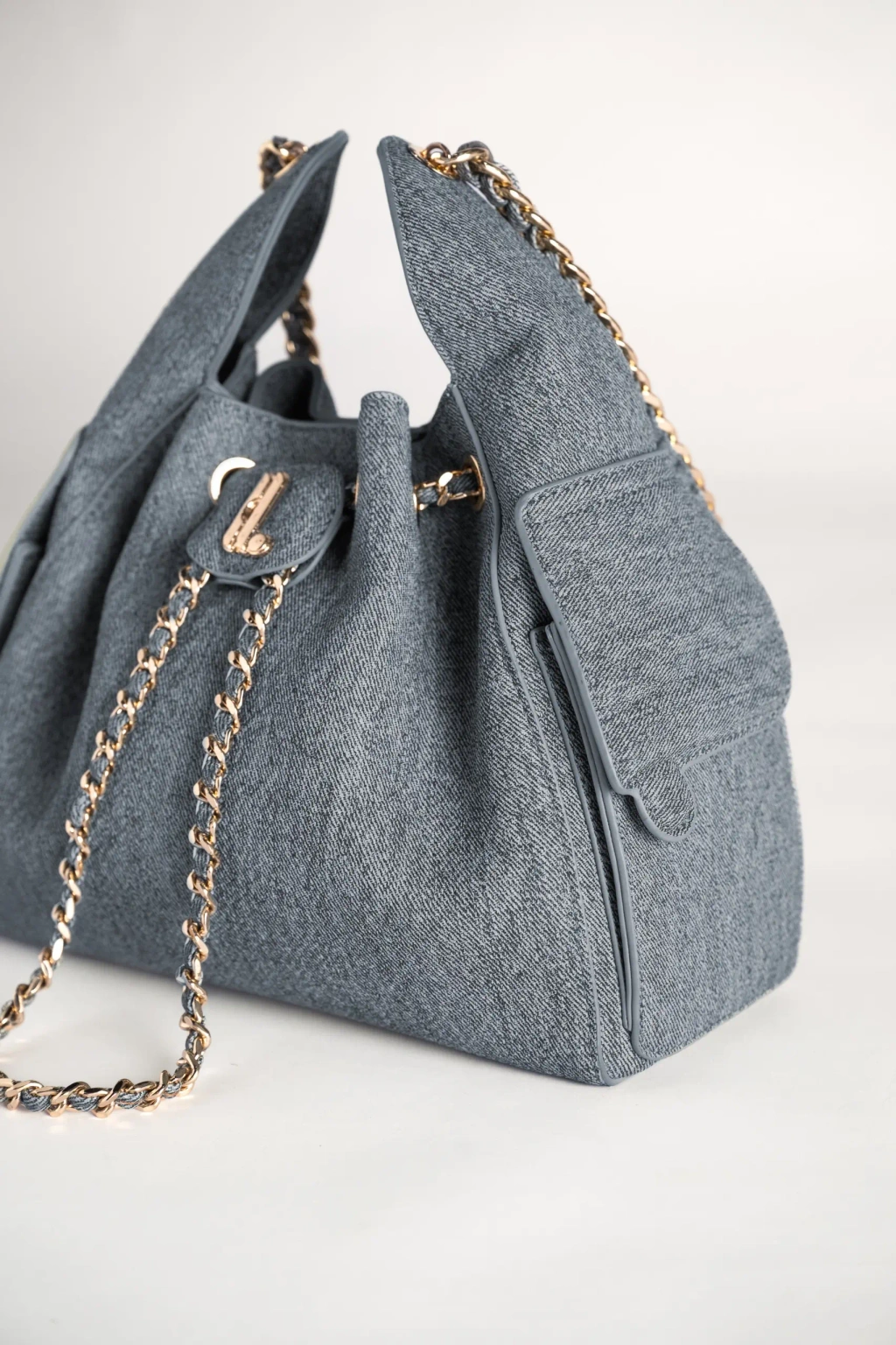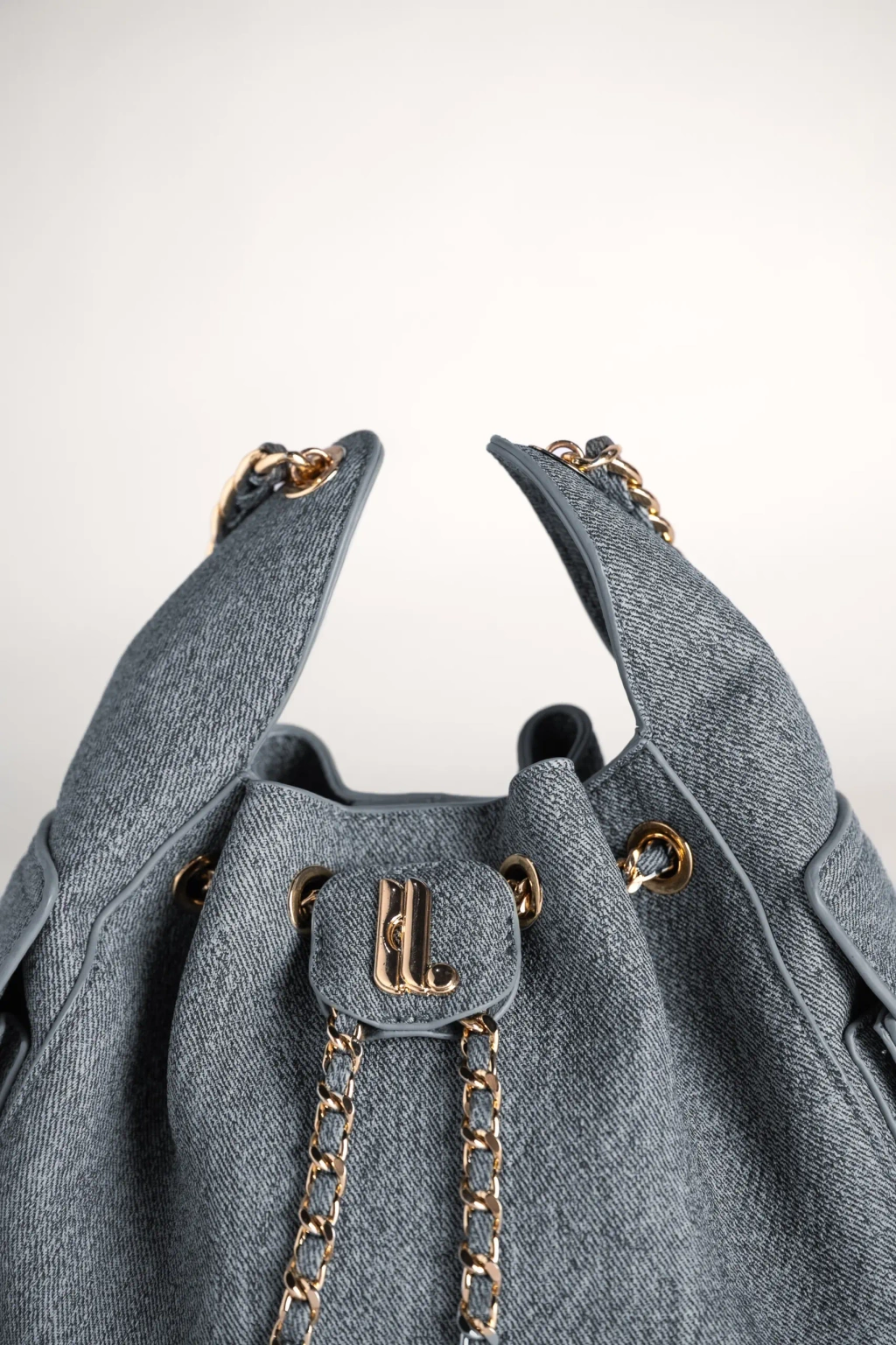 Bagian atas tas dilengkapi dengan sistem tali serut (drawstring) yang dihiasi rantai berwarna emas, terjalin dengan aksen kulit senada. Detail rantai ini tidak hanya menambah nilai estetika, tetapi juga mempertegas karakter tas yang anggun dan berkelas. Selain itu, material yang digunakan lebih ringan sehingga nyaman dikenakan dalam waktu lama (Lightweight). Di bagian depan, terdapat flap kecil dengan logo huruf “Heylocal” berwarna gold yang menjadi sentuhan khas dari desainnya.