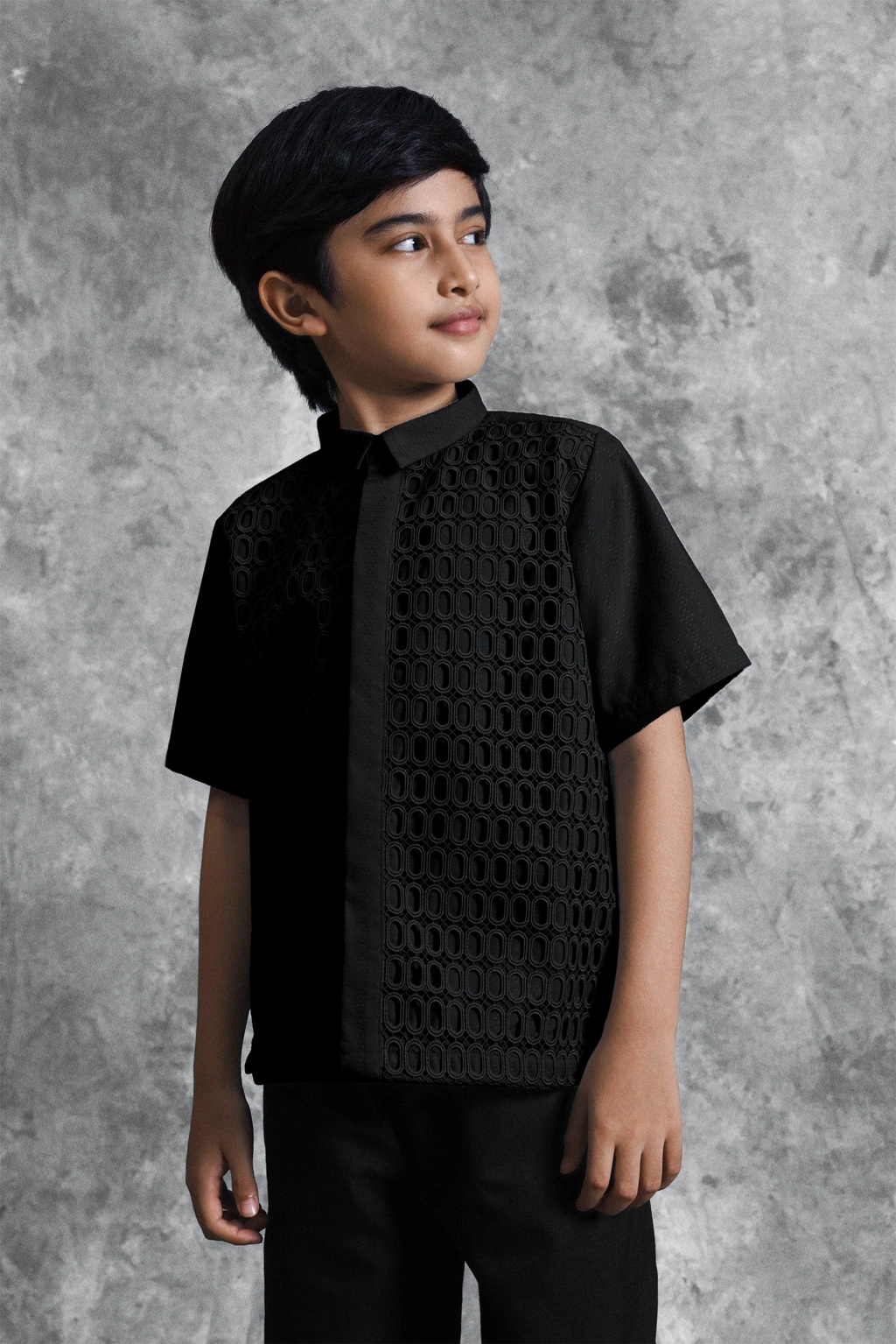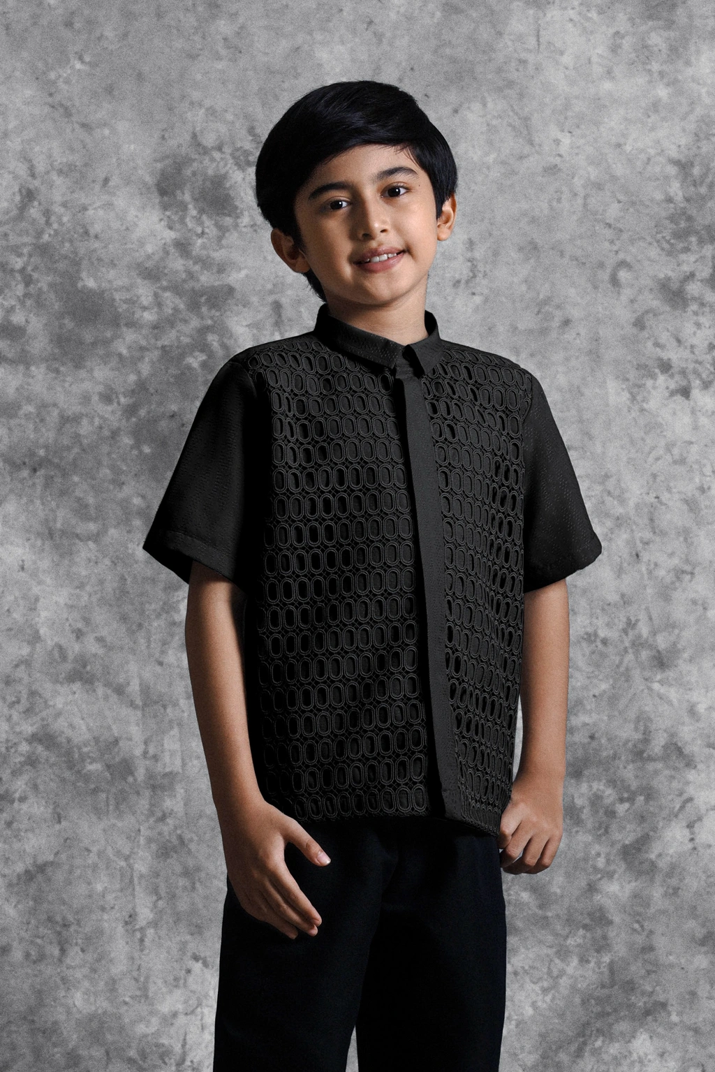 Kemeja anak ini hadir dengan potongan Regular Formal Fit yang dirancang khusus untuk kenyamanan anak-anak. Kemeja ini menonjolkan detail Lace Embroidery berbentuk oval yang tersusun presisi, menciptakan tekstur mewah yang unik pada bagian depan. Fitur Hidden Button memberikan kesan clean dan minimalis, menjadikan detail brukat sebagai pusat perhatian yang elegan. Pilihan sempurna untuk anak-anak tampil beda dan eksklusif dengan balutan craftsmanship modern di momen spesial bersama keluarga.