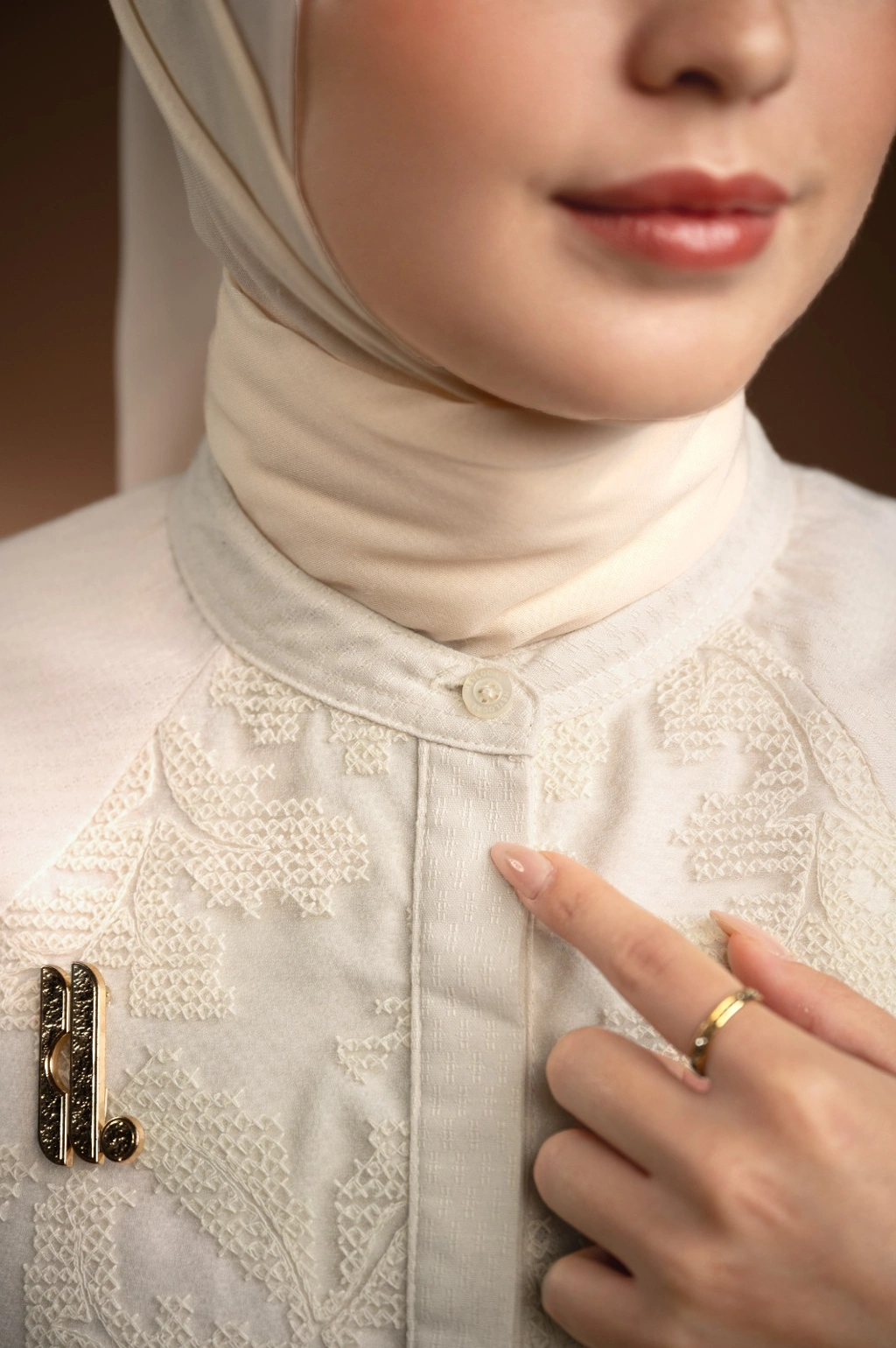 Kombinasi brokat flowy premium dengan bahan polos bertekstur memberikan tampilan yang berkarakter.