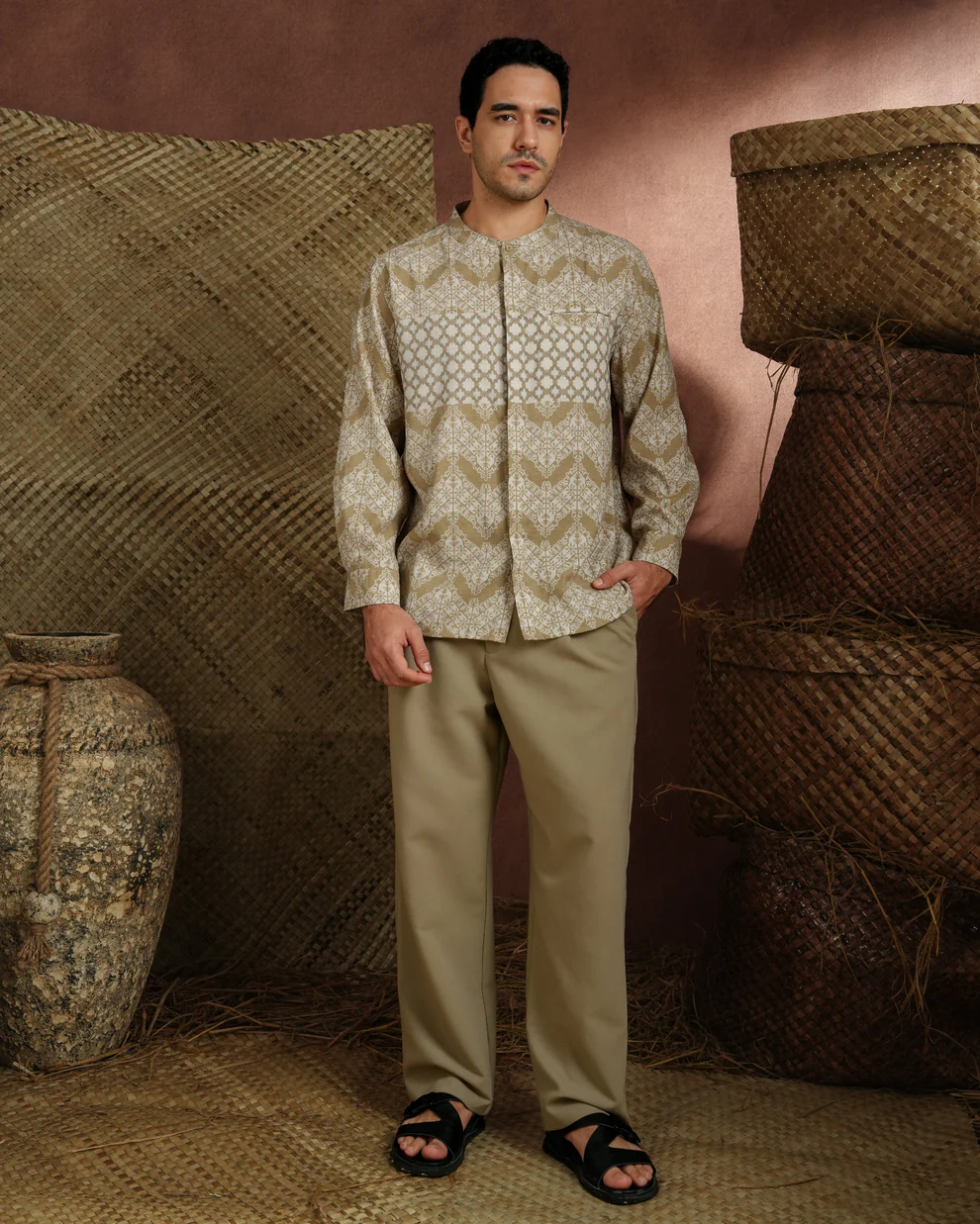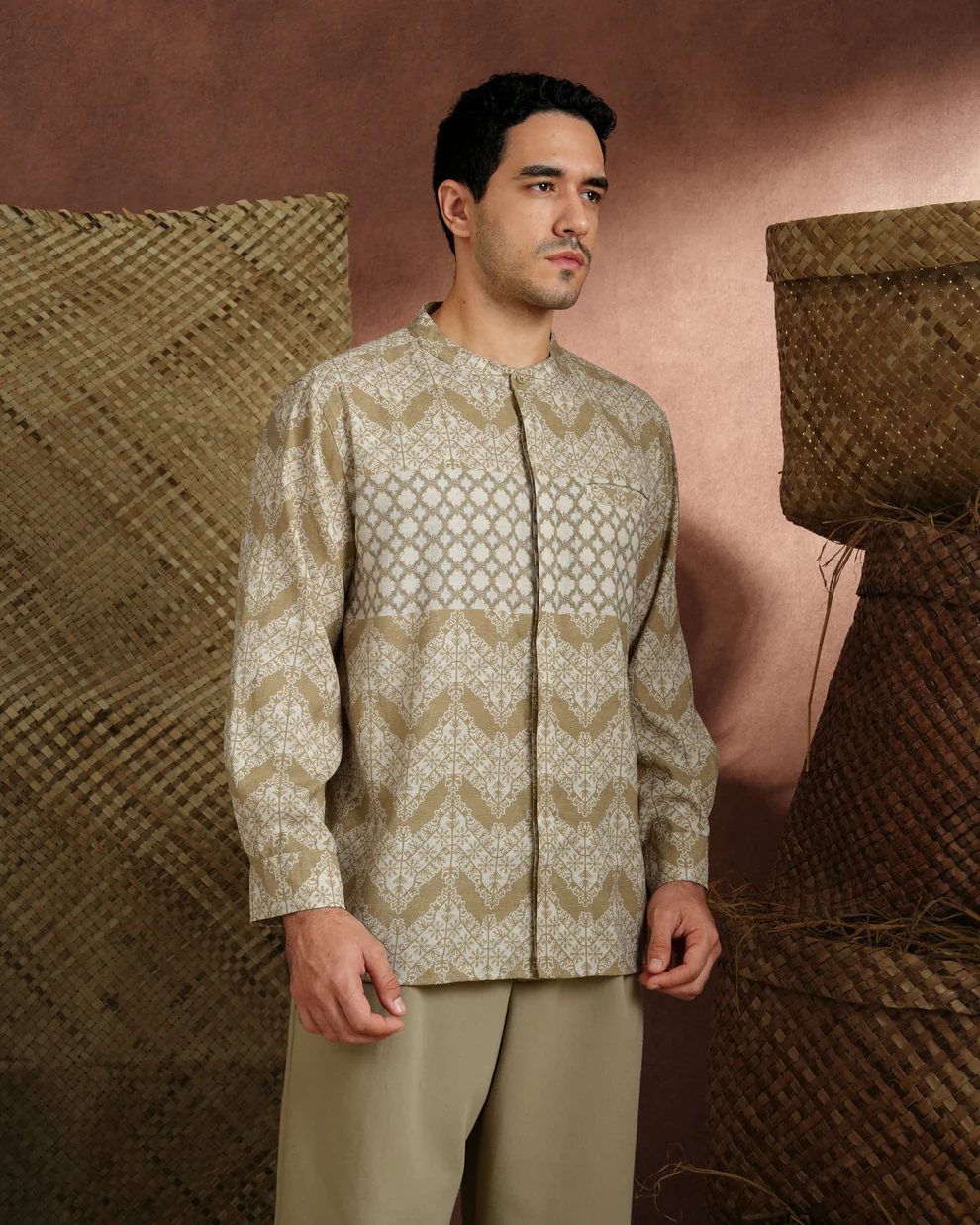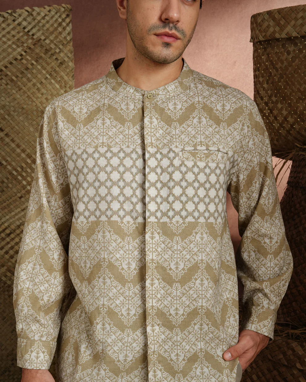 Baju koko lengan panjang dengan perpaduan conceal button, kerah bulat, siluet regular fit, dan sentuhan patttern yang elegan. Sempurna untuk temani momen Raya dan momen formal lainnya.