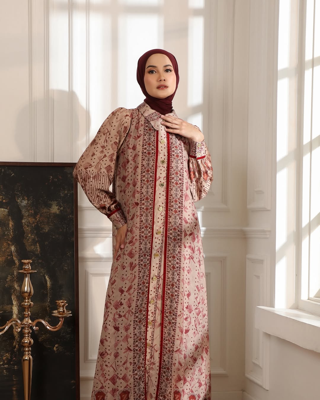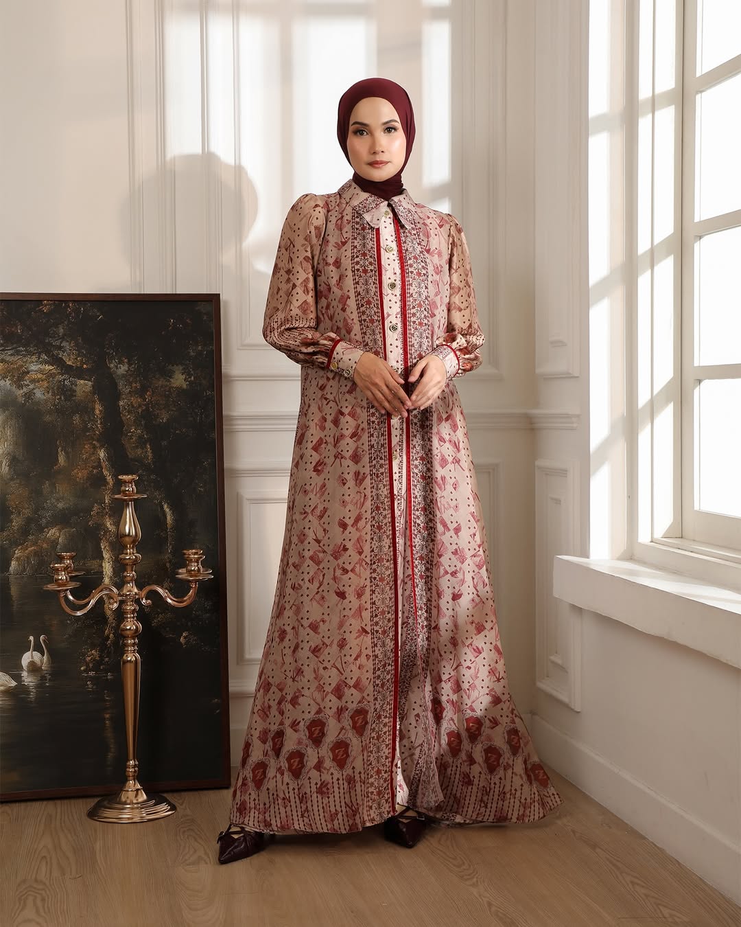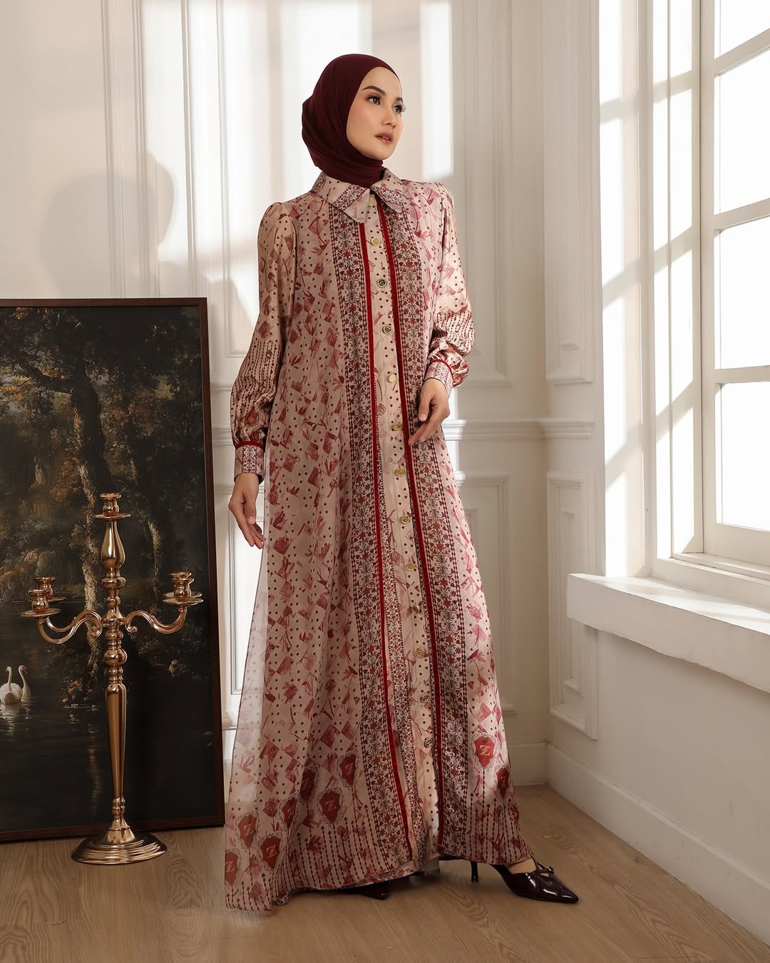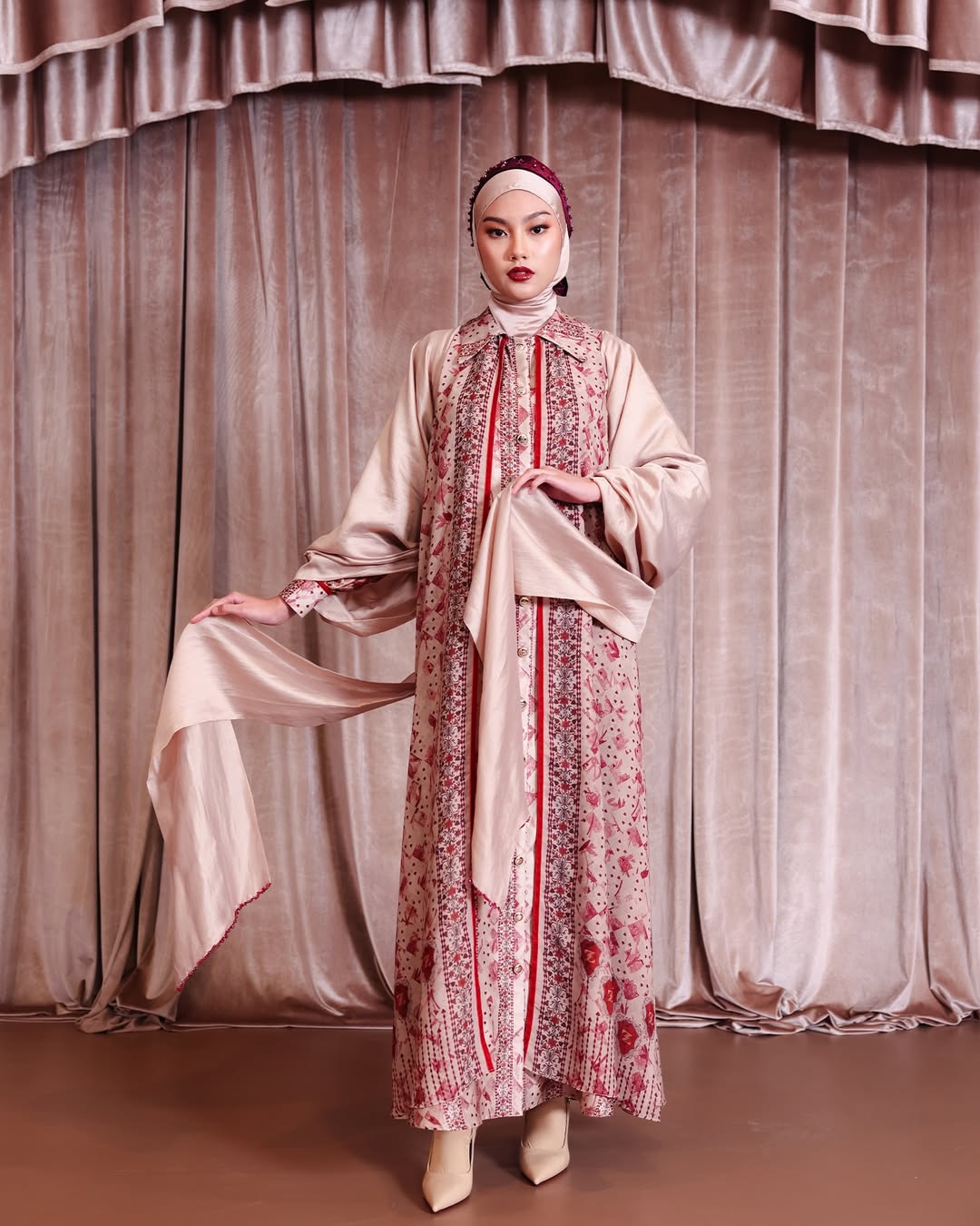 Perpaduan dua material berbeda—textured silk yang mewah dan chiffon yang jatuh—menciptakan tampilan yang anggun sekaligus nyaman untuk berbagai acara spesial.