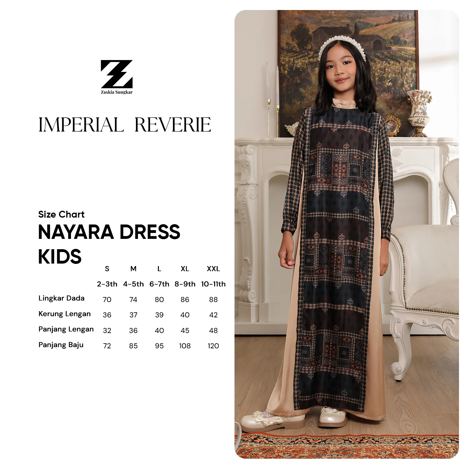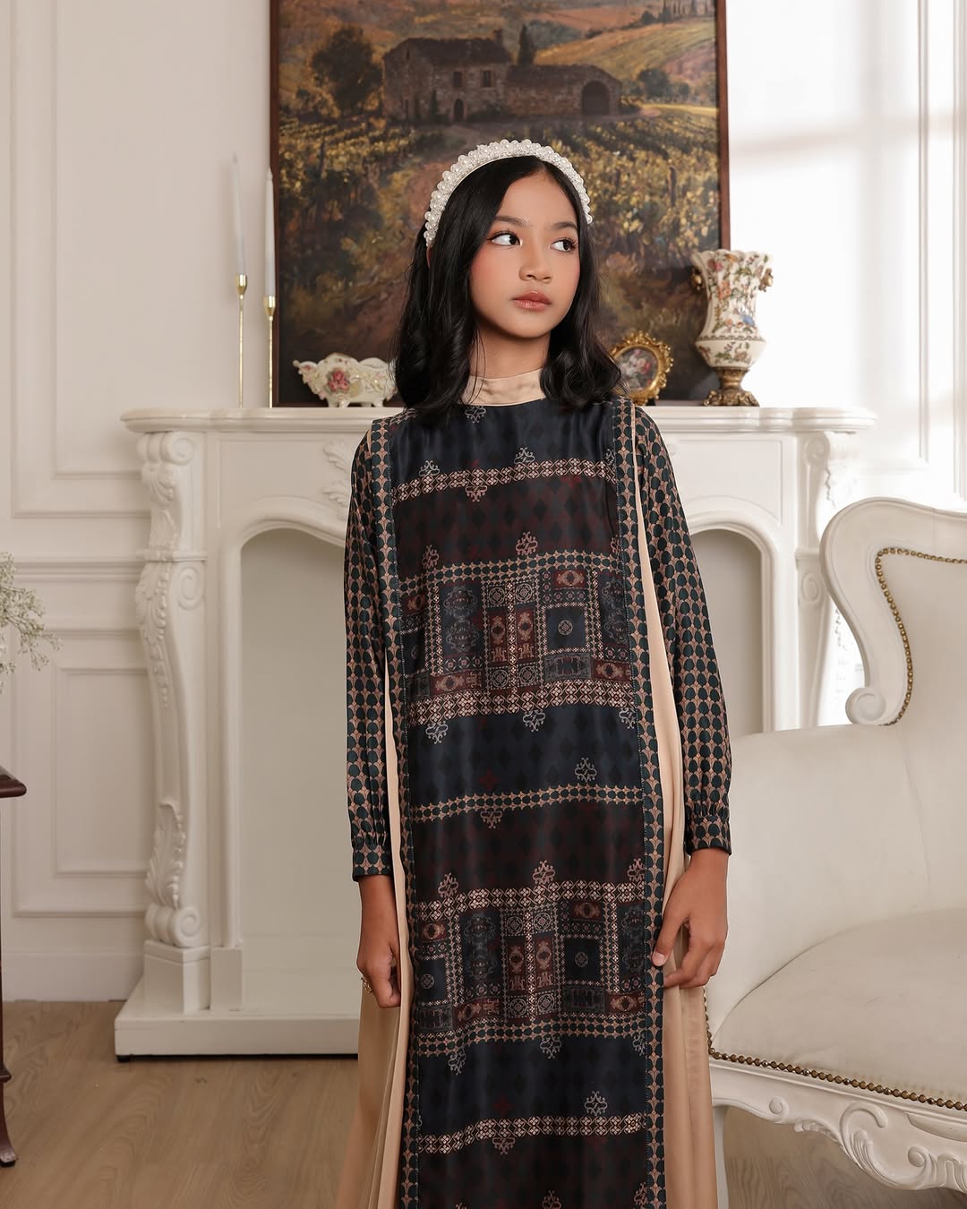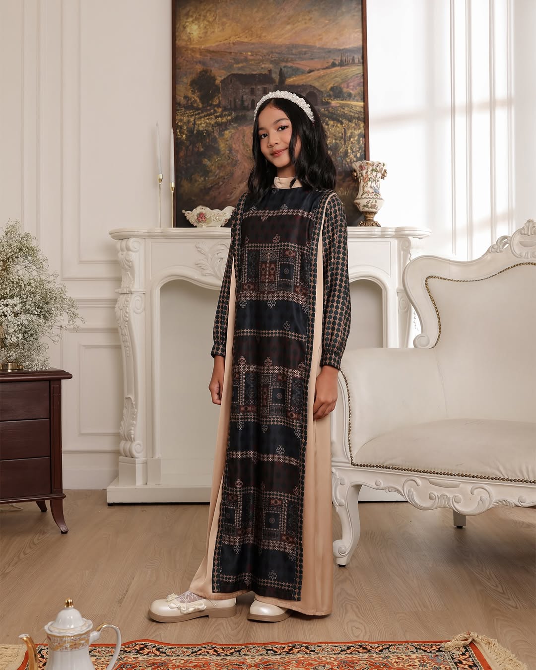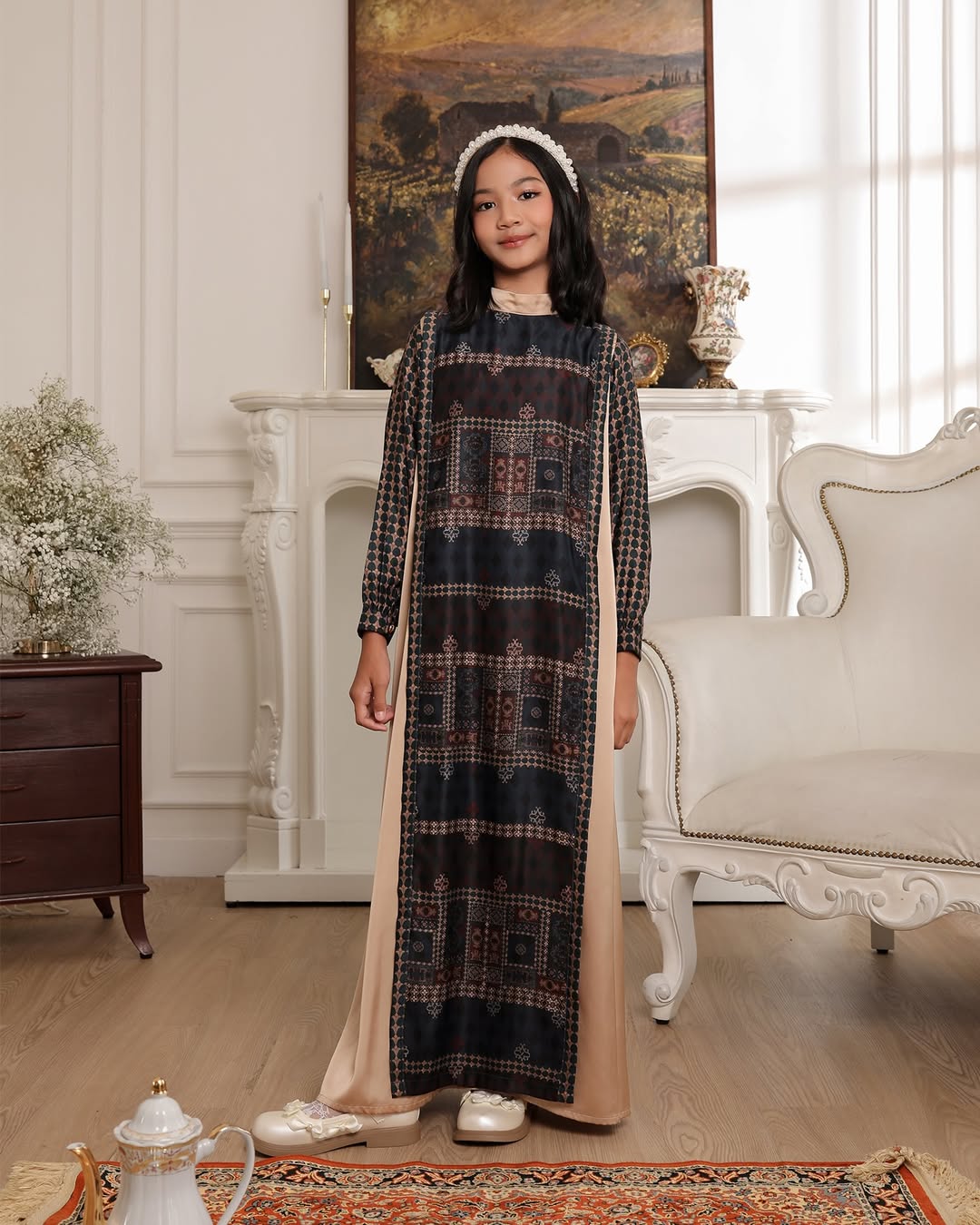 Dilengkapi panel samping polos yang memberi ilusi tubuh lebih ramping, serta detail panel depan (apron) sebagai aksen yang manis dan elegan untuk tampilan anak yang anggun.