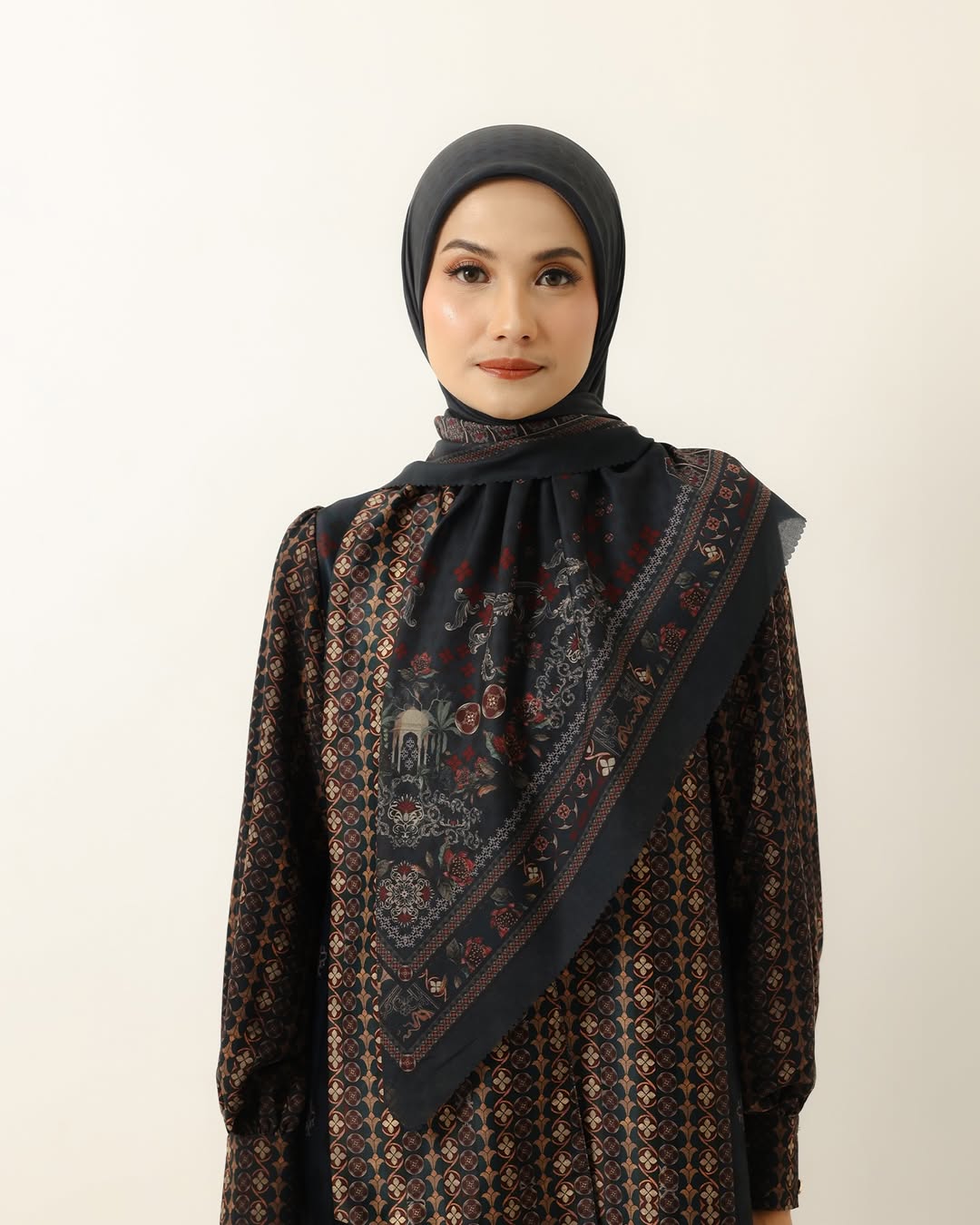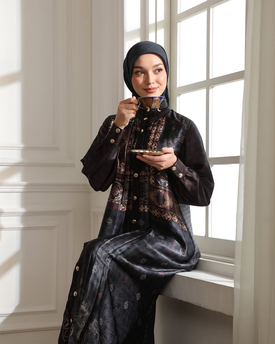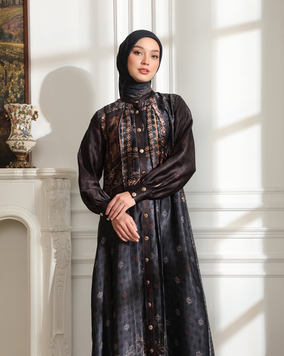 Hadir sebagai long dress dengan potongan lurus lebar (A-line jatuh) yang anggun saat dikenakan. Dilengkapi lengan puff dengan manset untuk memberi volume dan aksen feminin, serta detail tali pada bagian leheryang dapat divariasikan sesuai gaya.