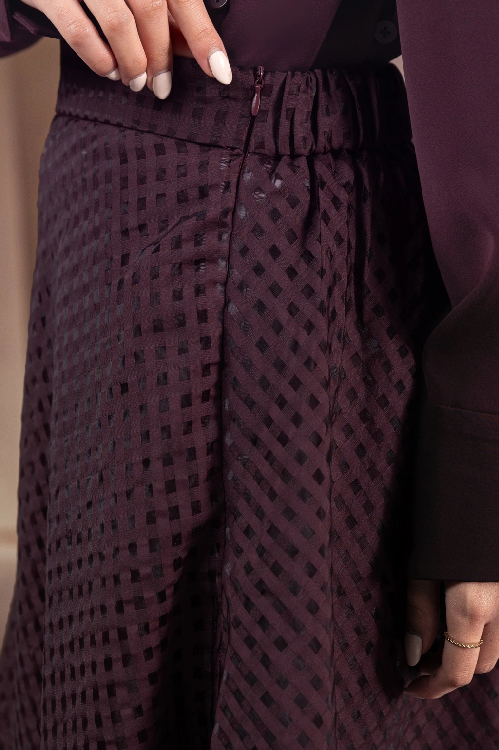 Skirt organza ini menghadirkan tampilan yang anggun dengan tekstur organza yang ringan dan memantulkan cahaya secara lembut.