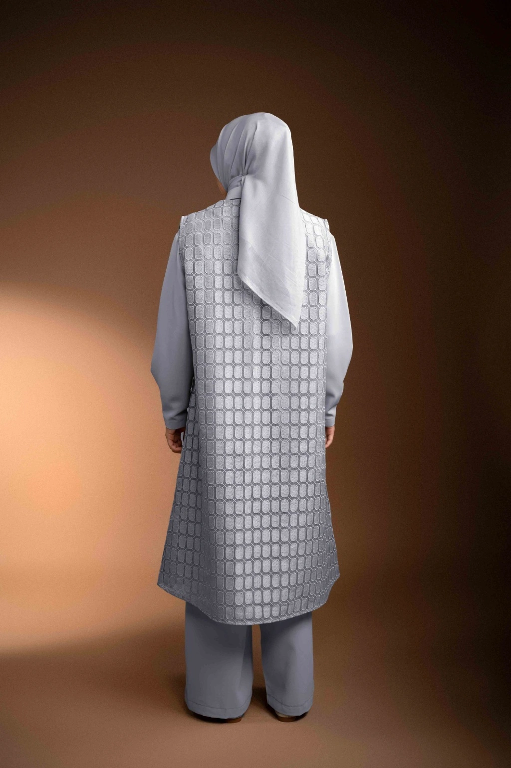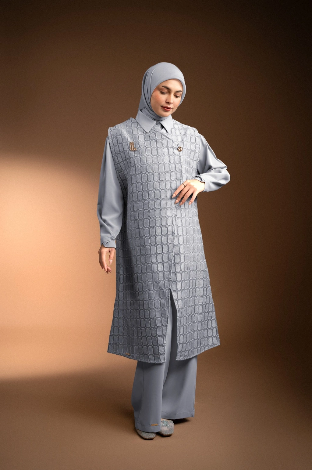 Vest panjang berbahan brokat organza premium menghadirkan tampilan classy yang easy-to-wear.